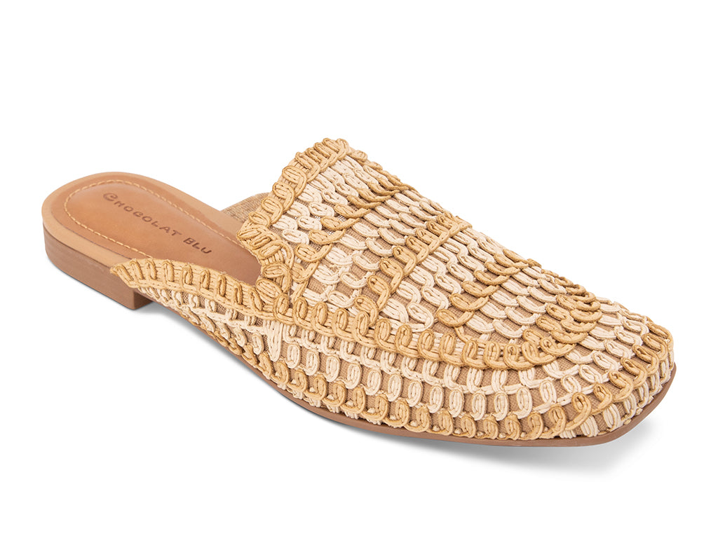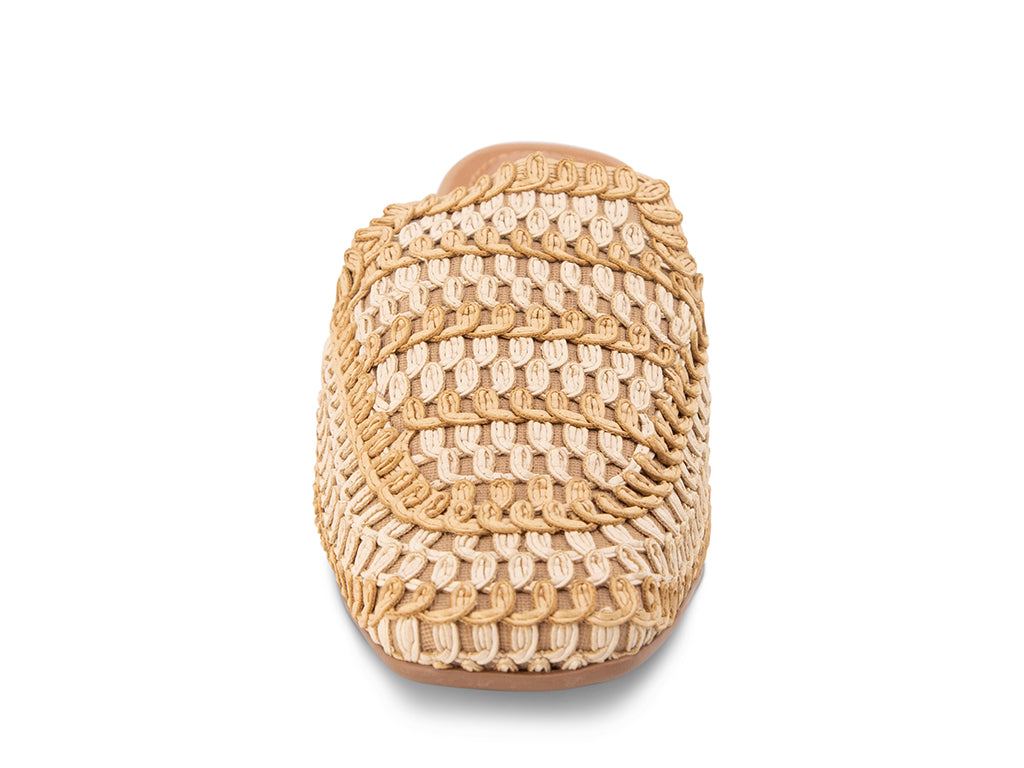 Timeless craftmanship meets effortless style in this beautifully textured woven mule. Designed in warm natural tones, this slip-on silhouette features intricate braided and looped detailing that creates rich dimension and artisanal appeal. Perfect for elevating relaxed linen sets, flowing dresses, or tailored summer looks, this woven mule brings texture and sophistication to any outfit.